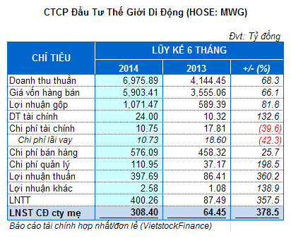 CTCP Đầu tư Thế Giới Di Động (HOSE: MWG) vừa công bố BCTC 6 tháng đầu năm với doanh thu tăng mạnh 68%, đạt gần 7,000 tỷ đồng. Lãi ròng tăng lên 308 tỷ đồng, cao gấp 4.8 lần so với cùng kỳ năm trước. Với kết quả này MWG đã đạt hơn 70% kế hoạch trong năm 2014.